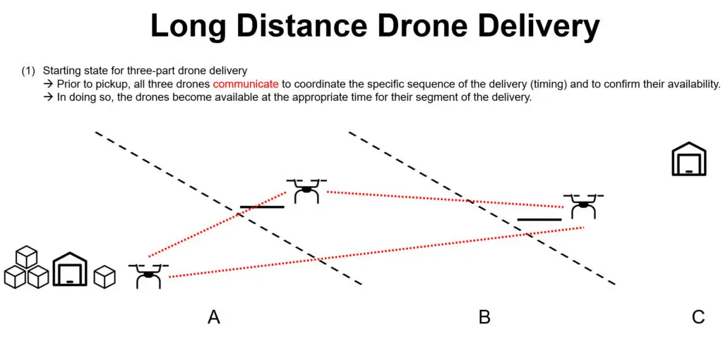 A coordinated network of autonomous drone systems for long distance delivery.